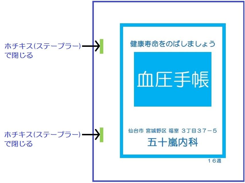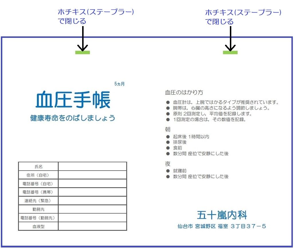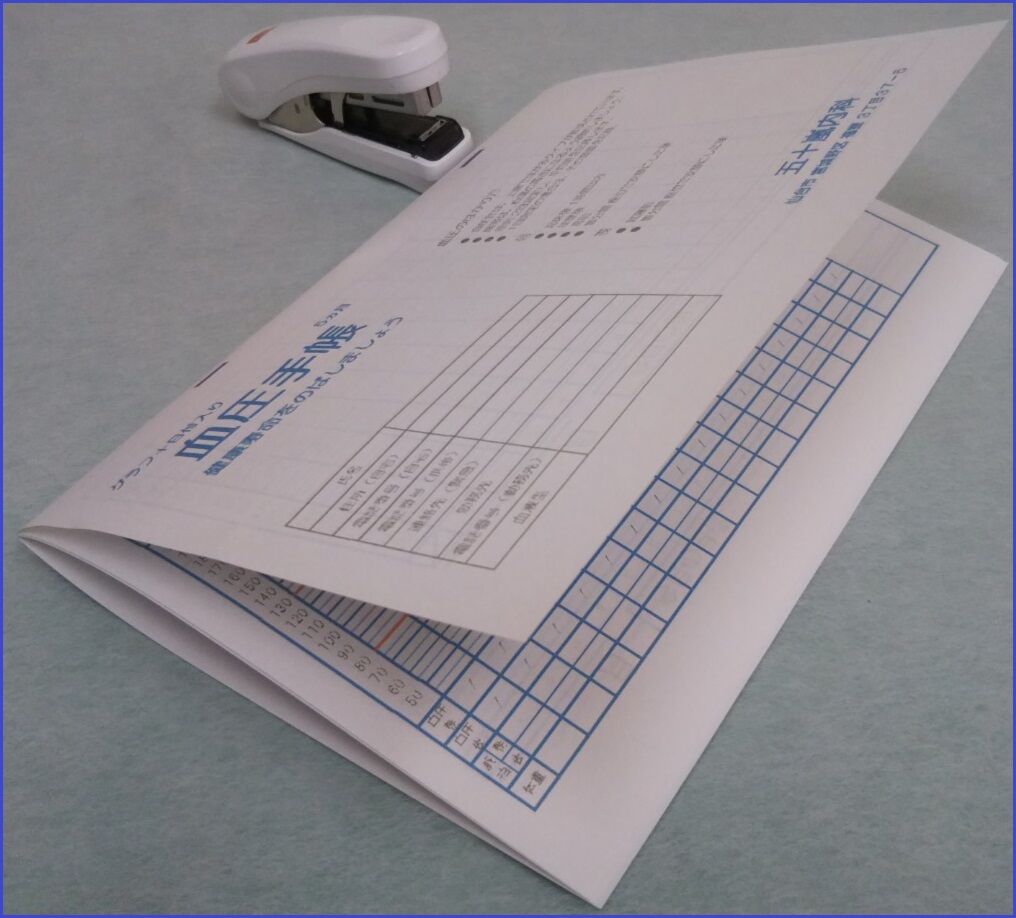 印刷後まとめて2つ折りし,ホチキス(ステープラー)で閉じると冊子タイプの手作り血圧手帳ができます。